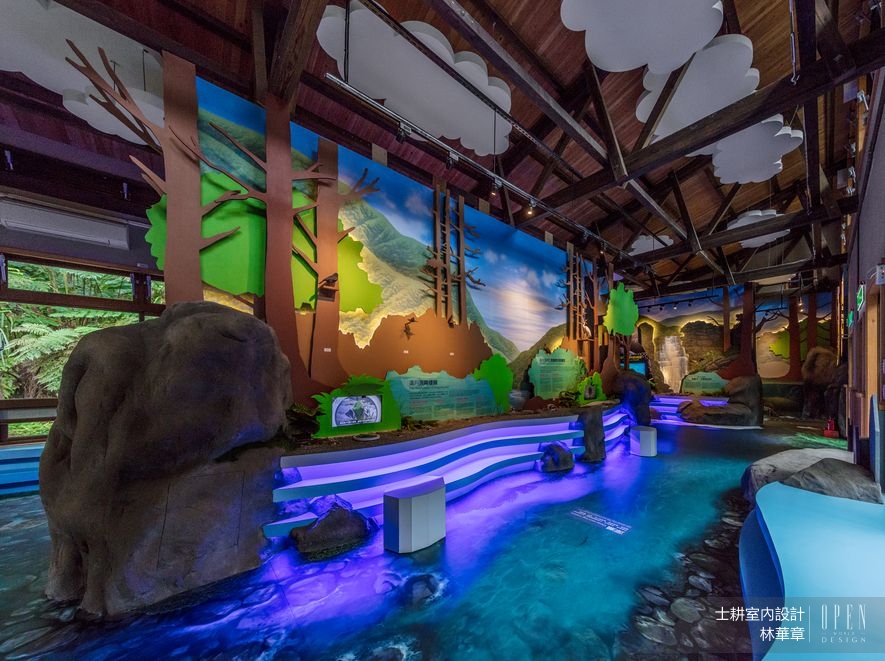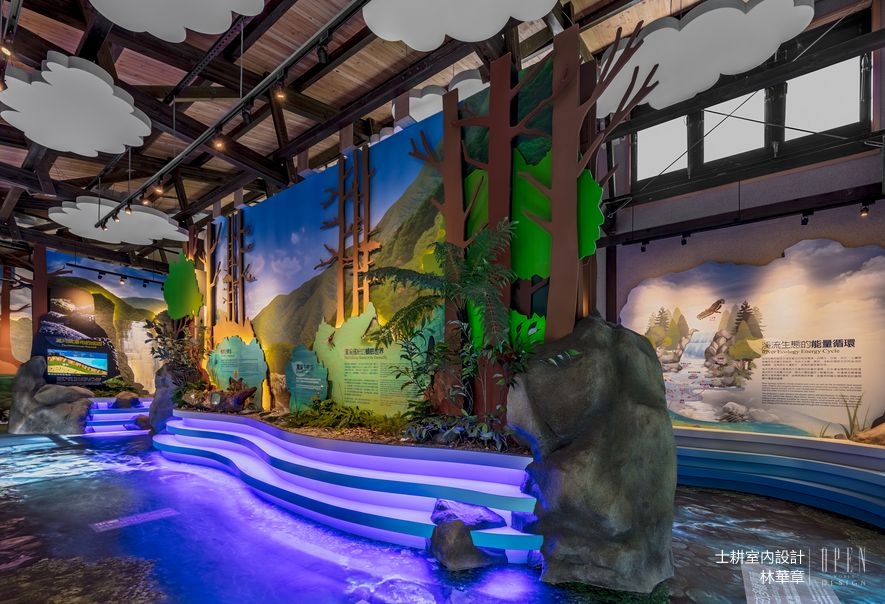 而在片片白雲指路下,遊客最後來到充滿流水意象的「溪流館」,以豐富的水域生態為基礎,隨處可見崎嶇石塊及閃爍波光,沿著特殊的燈光穿行於微暗空間,彷彿探身水下世界;曲型的鏤空階梯搭配間接燈源,使瀑布河階的天然層序有了另一種詮釋,當人逆流而上趨近高層展板時,細膩的介紹文字與感應互動反應這才浮現眼前,悄悄貼合參觀展館及遊歷自然的行為模式。