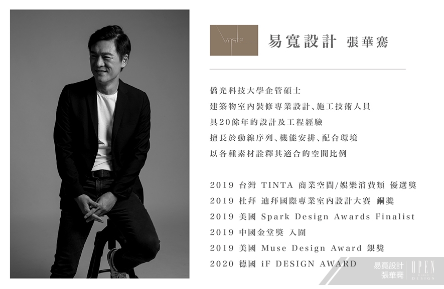 午後,一位著輕西裝的紳士走來,正是OPEN團隊今日的邀訪對象——易寬設計 張華騫 設計總監 ,笑得親和、毫無架子,沉穩的語氣讓人很難想像,竟是時下網美餐飲店的幕後推手!我們喝著咖啡、品嚐小點,愜意地閒聊,一同回顧他20多年來的設計故事……