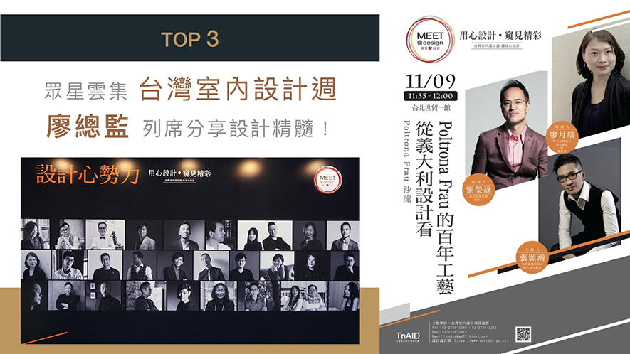 聯合台灣、香港、新加坡等地的設計協會共同發起的全方位華人設計界盛會——「台灣室內設計週」,在2019年邁入第4屆,受邀為與會嘉賓的廖總監,協力其他藝術家及設計師,將室內設計與藝術生活美學推廣至大眾。
