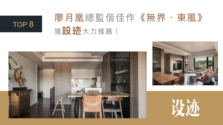 透過與屋主的逐步討論,以滿室相互映光的木石質材為底,廖總監為喜愛東方藝術的收藏家夫婦所打造的《無界.東風》暖氳繚繞、跳脫既定語彙的空間線條,描繪出珍藏屋主美滿回憶的悠然之家,並縱身躍上設迹版面。