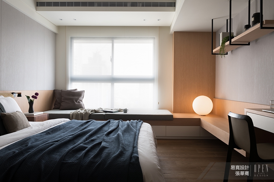 米白拼貼淡橙色調的次臥,藉由簡約的鐵件吊櫃與柔和燈光打造清新雅居;鐵件的鋼,木質的柔,在暖燈照映下完美合一。床邊的書桌與窗邊L形臥榻連結,延伸視覺平衡感;望向窗邊,百葉窗透進和煦日光,隱隱露出窗外景色,悠然之感油然而生。