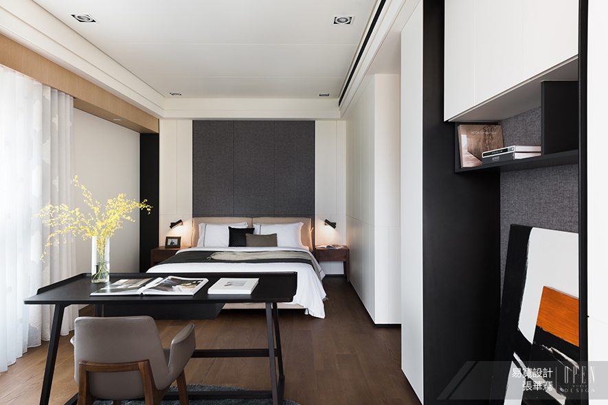 (圖)主臥以深褐色地坪承載其上的家居什物,純白壁櫃的清新爽朗氣質,刷淡周遭深色為主的環境色,讓臥室在穩重的同時又不失輕盈美感。
