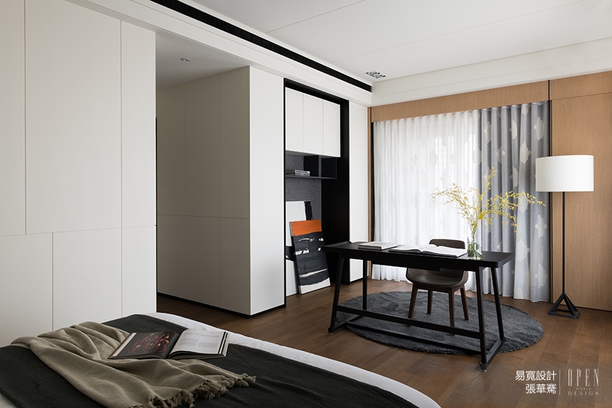 沿著直向廊道到達私領域,進入包含簡易書房的主臥室,壁面交錯不對稱線條,為空間帶來律動感,搭配細膩鐵件,和溫潤木皮及進口壁布相襯,呈現不同材質間相搭的和諧;床頭的深灰色繃布,自潔白壁面的包夾中傾瀉而下,完美揉和深淺色系,而灰色低調的特性,也作為地毯襯起一方小天地,讓閱讀和休憩兩者機能完美共處。