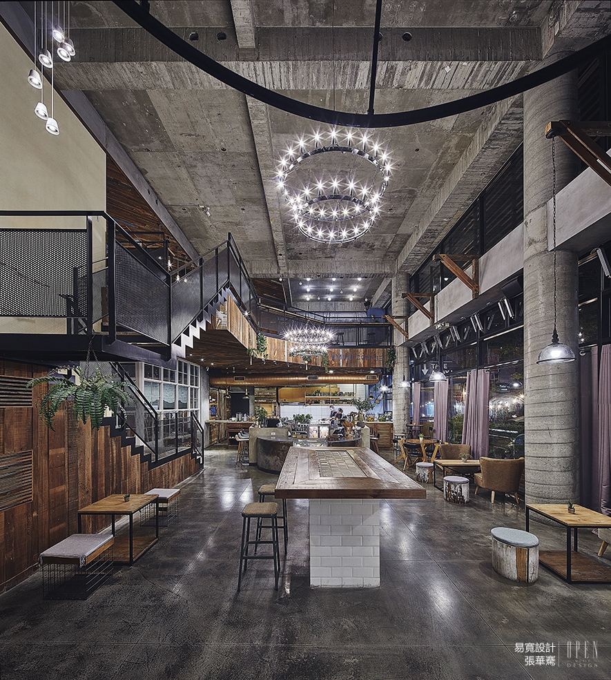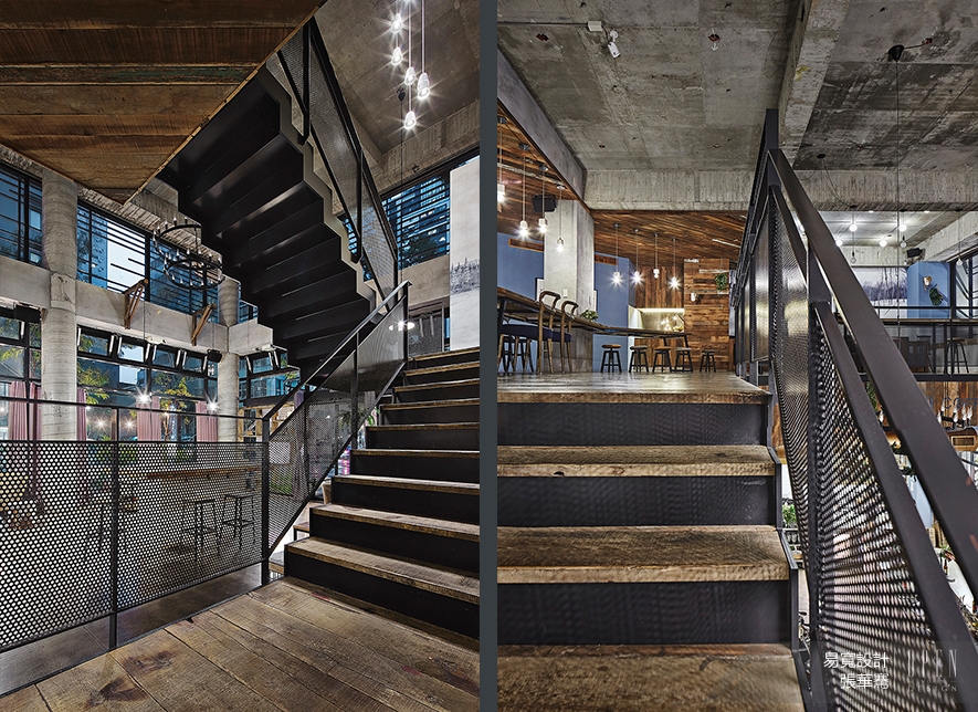 一樓櫃台銜接入口處的長桌,組合而成空間中的軸線,扮演著服務及互動的角色;馬蹄型的吧台設計,亦在收放之間呼應了共享的生活態度。而特別劃設出來的平台閣樓,以穿透的玻璃隔間作為過度區域,連接至二樓餐區;於此的座位配置,應合空間動線做了方向性的轉折,並輔以天花板的斜拼木料,增添視覺上的豐富層次。