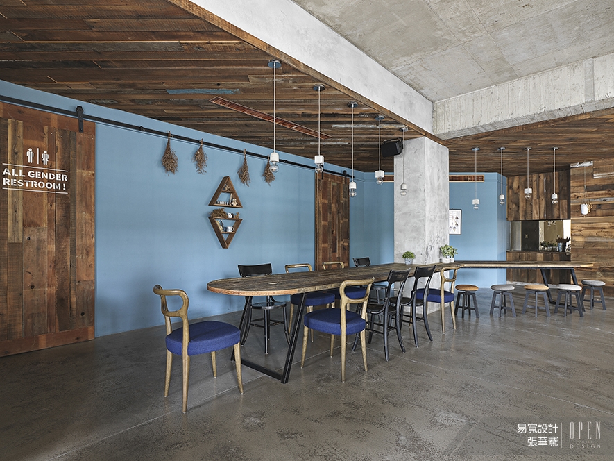 "Hygge" is a state in which happiness can be felt in the ordinary days, there is no need to arrange deliberately but to create a cozy space with heart. Follow the ideology; we retain the original cement texture of the building, and processing with exploiting the recycled wood. By way of the large area lighting and the hollow pattern, thence construct excellent connection and flowing, as well shapes the natural implication in the urban jungle. Prussian blue as the representative color of the enterprise, which apply on the outdoors canopy, the LOGO on the metope and the indoor sofa. All above embellished with a touch of vivacity in the whole space, moreover lightly emits the notion of the brand.