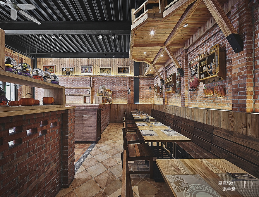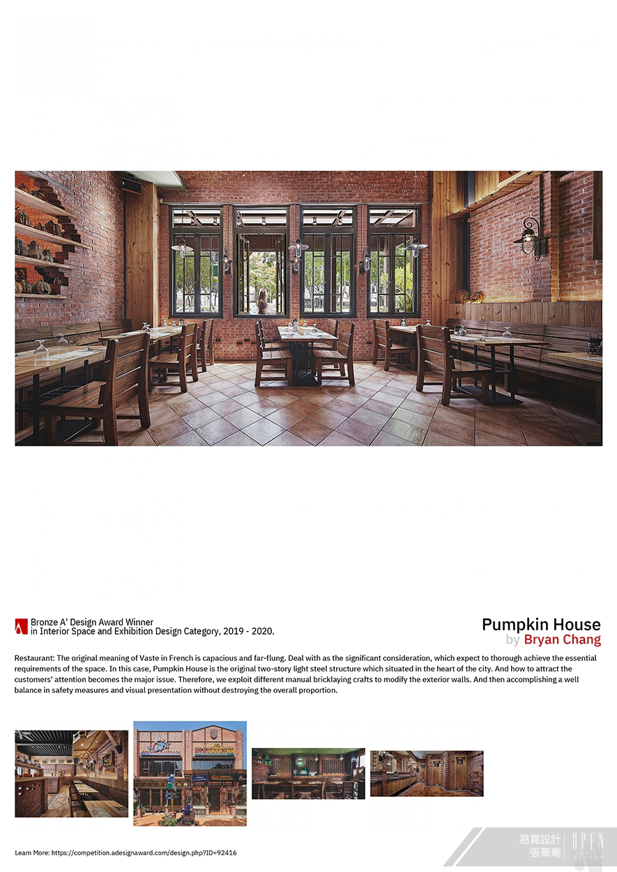 呼應品牌「PUMPKIN HOUSE」的南瓜系列餐點,藉由色調及氛圍的調配,呈現整體視覺上的鮮明印象,並延續建築外觀的紅磚元素,與之運用在空間各角落。