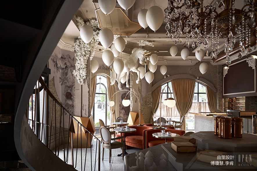 ▲擷取古典幾何弧形線條,運用在拱型的門框、牆面、燈架、沙發、桌櫃的腳、椅背,以及串連一二樓的金色迴旋樓梯,線條讓空間柔軟,以回應夢幻場景的主調。