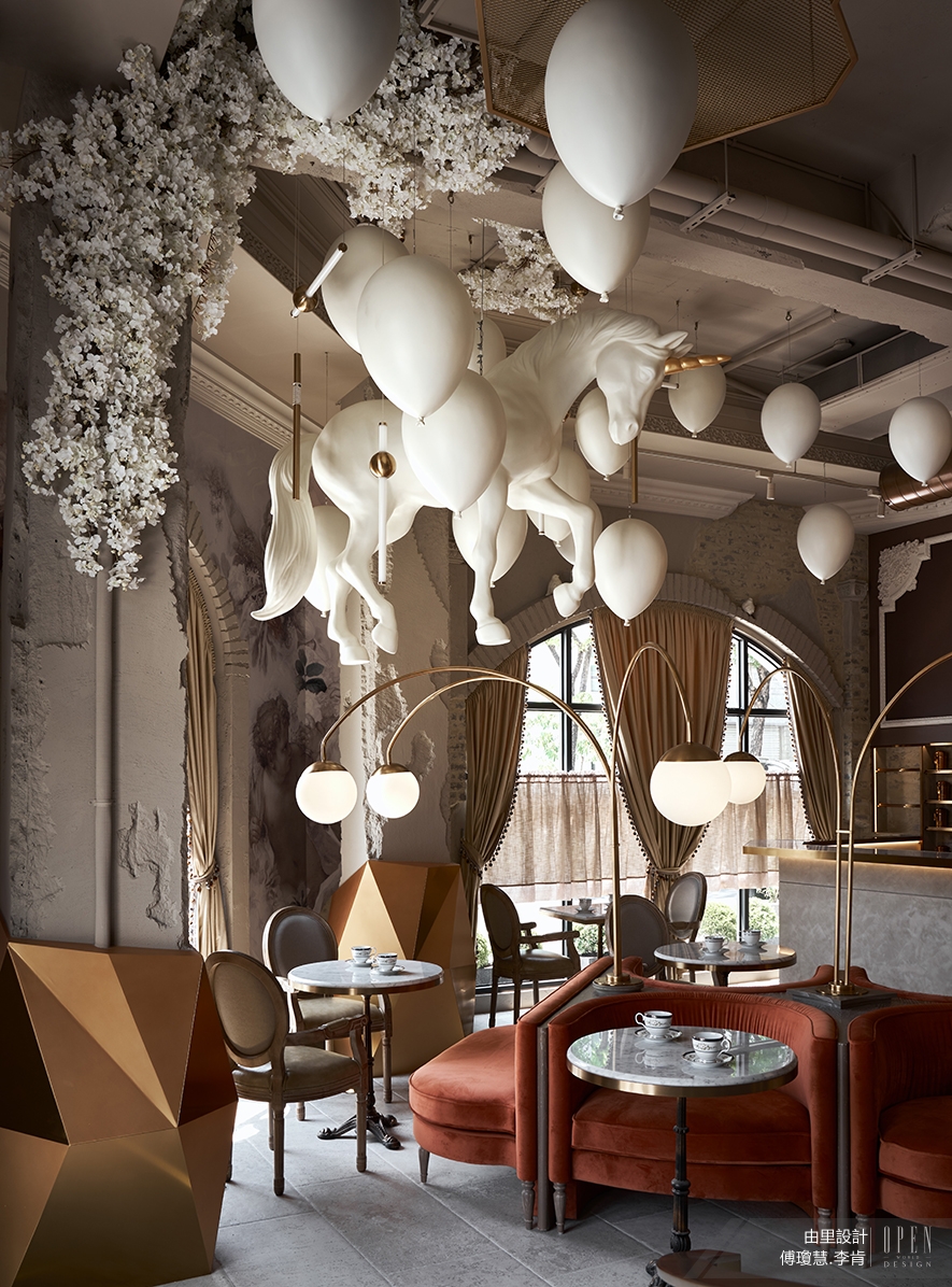 ▲將如夢幻泡影卻永遠不會破的氣球懸吊置頂、飛天獨角獸在頭上奔馳、白色繁花從天花板柱子長出垂降,像是峭壁懸崖生出燦爛花朵般的充滿驚奇⋯⋯種種帶著不真實感的場景。