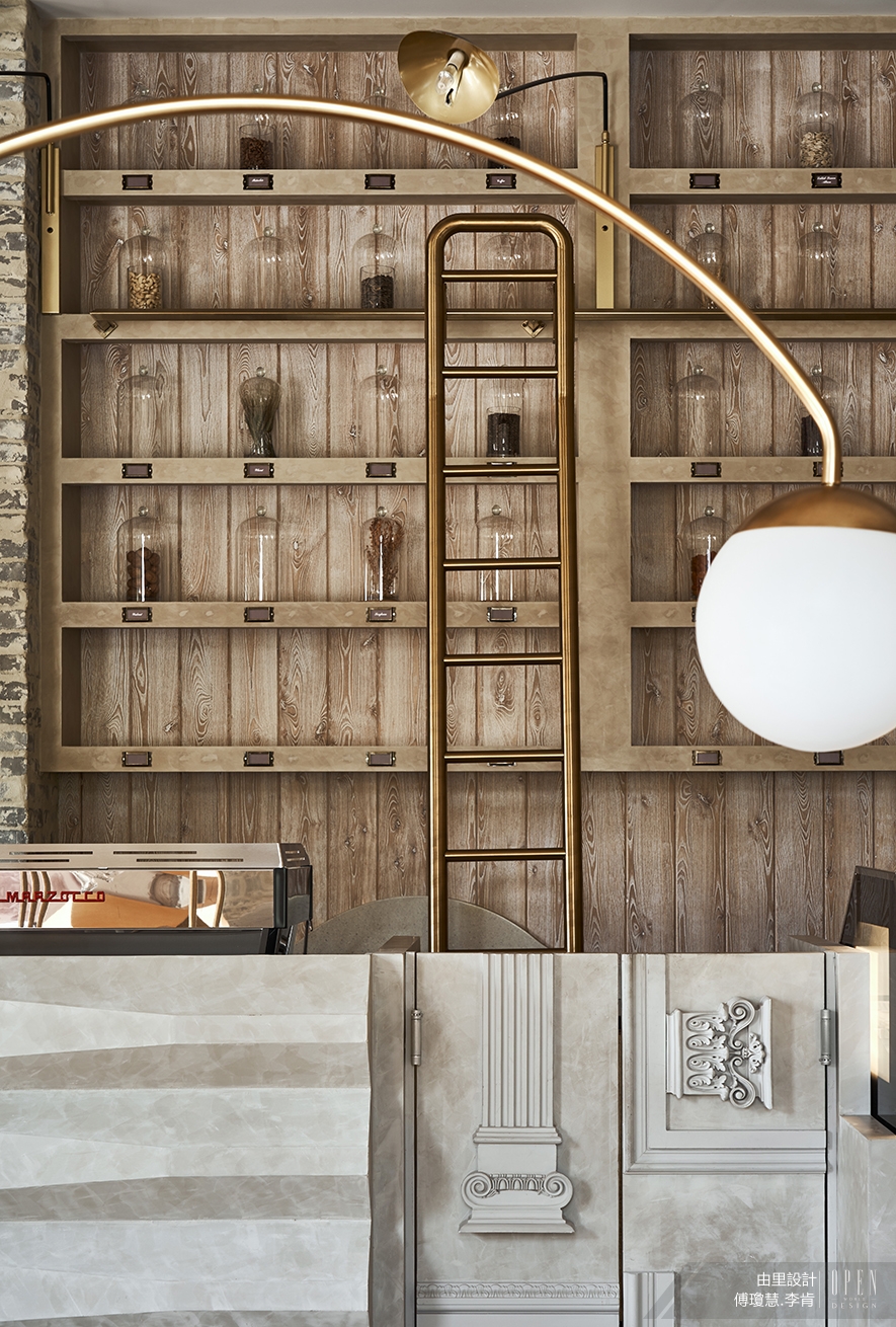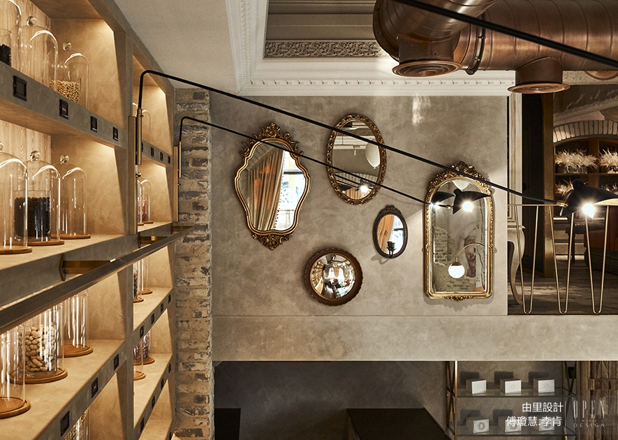 ▲拉了古典線條的長軸檯面,與整面裝置製作洋菓子原料元素的玻璃瓶櫃置頂,定義自由往返現代與古典的跨時空尺度,呈現精緻與原料粗獷之間質量對比的衝突。