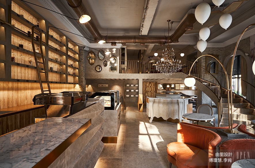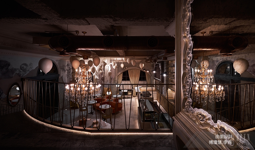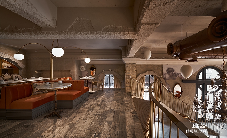 ▲場景設定為法國中世紀,帶有歷史感的設計手法,適度運用於空間各處:例如:部分保留建築物原狀,天花板與柱體拆模時特意留下痕跡,並作舊處理。