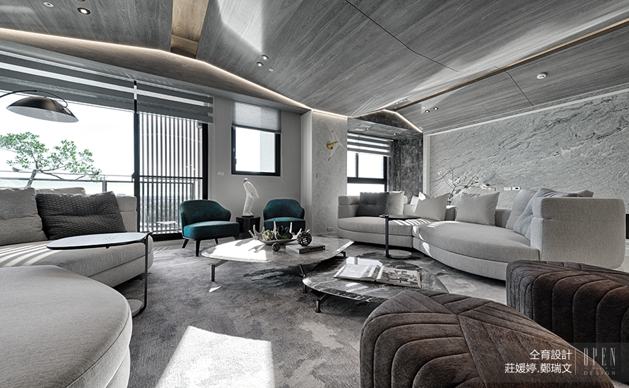 進入大門,眼前呈現的是一片別有洞天的景色。設計師以極為開放的住家視野,迎接在都市高壓生活下疲憊歸家的屋主。整體色調採用使人放鬆的大地色系,搭配湖水綠單椅與綠色植栽造景,將自然氣息納入室內,主牆則以大理石獨特的霧面與自然紋理,帶出宛若潑墨山水畫的質感。