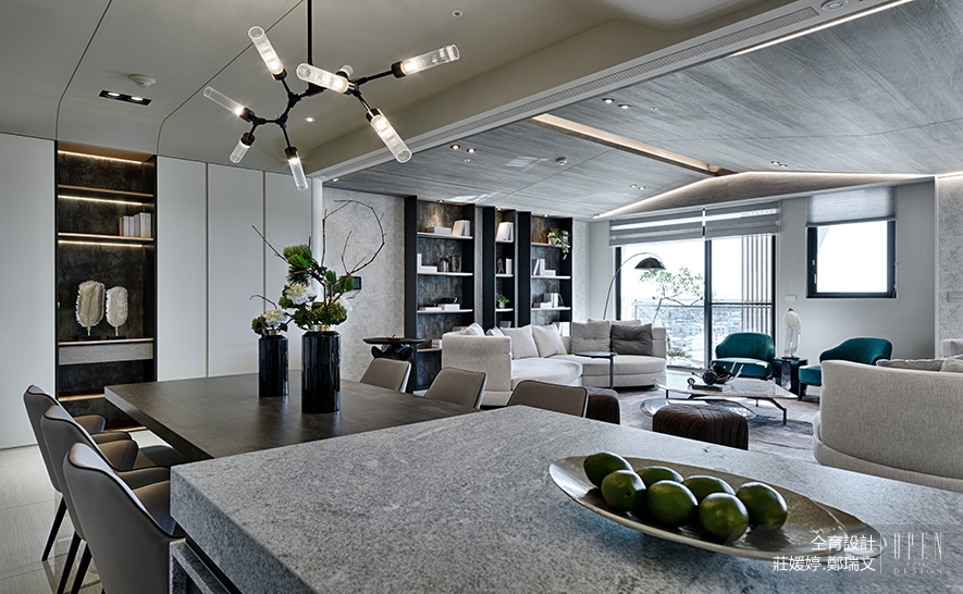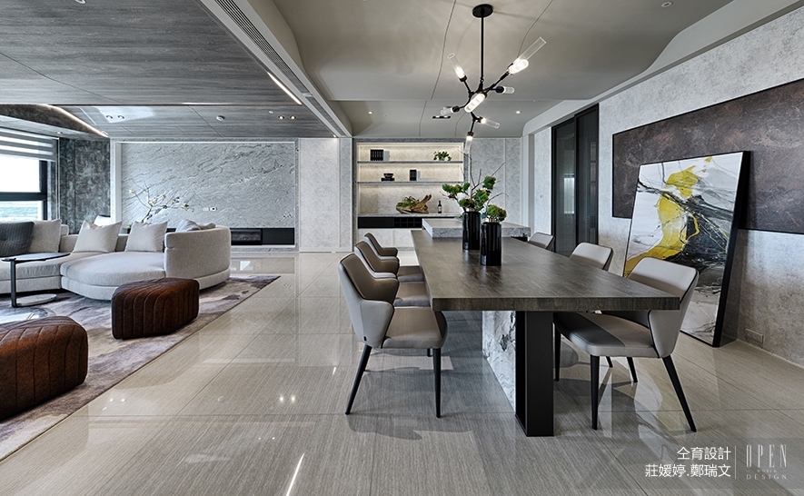 面對客廳的開放式用餐區,使落地窗引進的自然光同時灑落兩區,使整個公領域更加開闊且充滿變化。餐桌以木、石組成,分別呼應客廳的木紋薄板與天然大理石建材,而餐區上方懸掛的特殊造型燈具,則低調展現細膩品味。