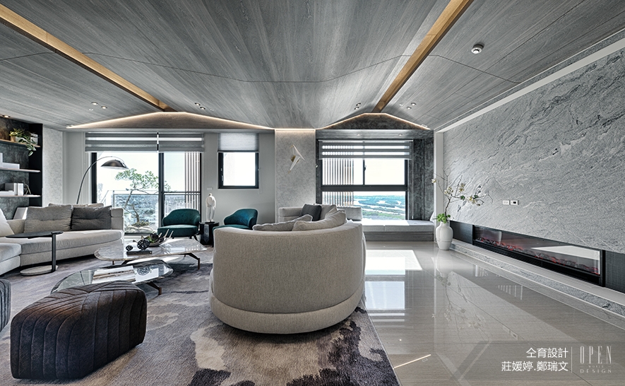 (圖)客廳主牆為冷硬的大理石,配上溫暖的壁爐,兩者相互交融陰陽調和,形塑悠然舒適的氛圍。