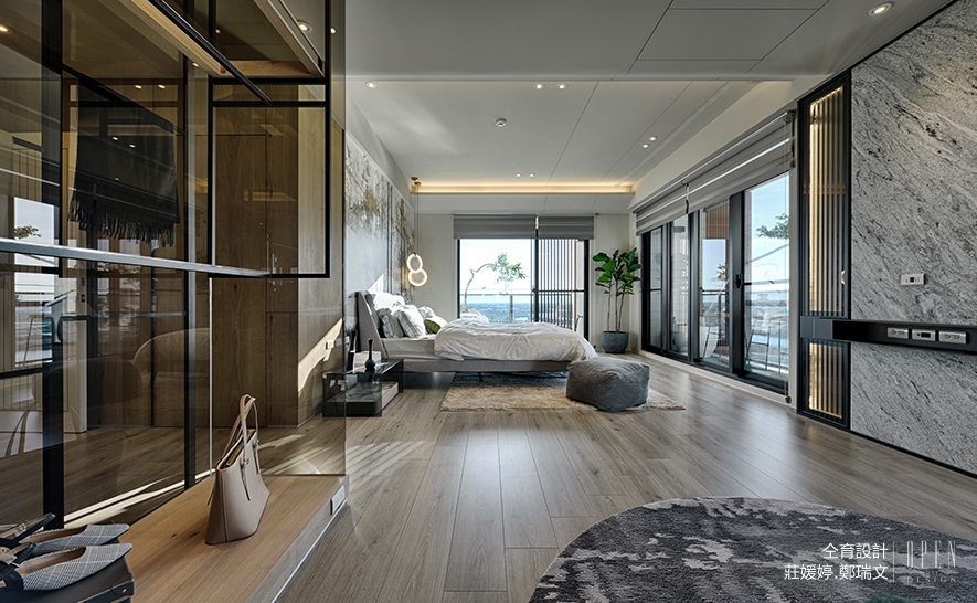 轉入私領域,又進入另一處截然不同的風景。床鋪兩面採光優良的落地窗,可讓屋主愜意的倚床賞景,而除了必要的寢具外,也另外安置了以沙發、茶几與編織地毯組成的起居區,當坐臥於此處泡茶品茗,並沐浴於光線柔和的內嵌燈下時,便彷彿置身幽靜的度假勝地,不必特意安排外出旅遊,在家中即能遠離城市喧囂。