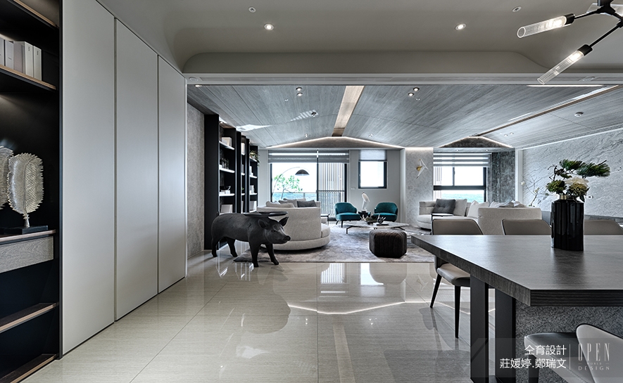 (圖)空間面最廣的天花板,在客廳呈現山陵的感覺,轉入餐廳則換為柔和的流水意象,運用「太極」概念提升空間的協調度。