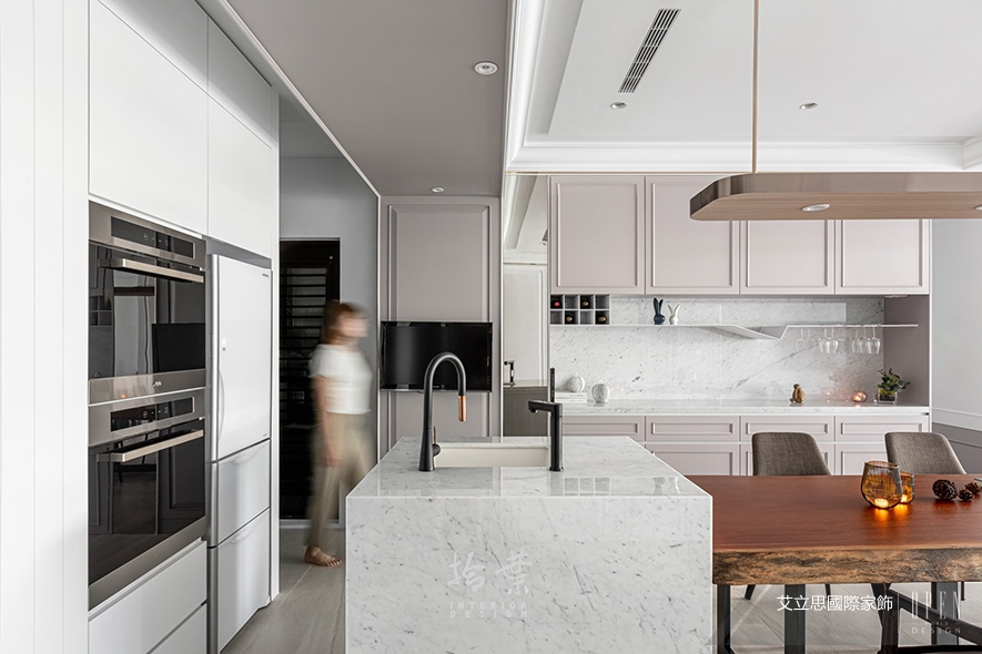(圖)餐廚櫃的大理石背牆,與同質地的中島洗手台相呼應,而白色層板的V形構造,除可暫放紅酒瓶外,亦有增強鐵件結構線條的效用。