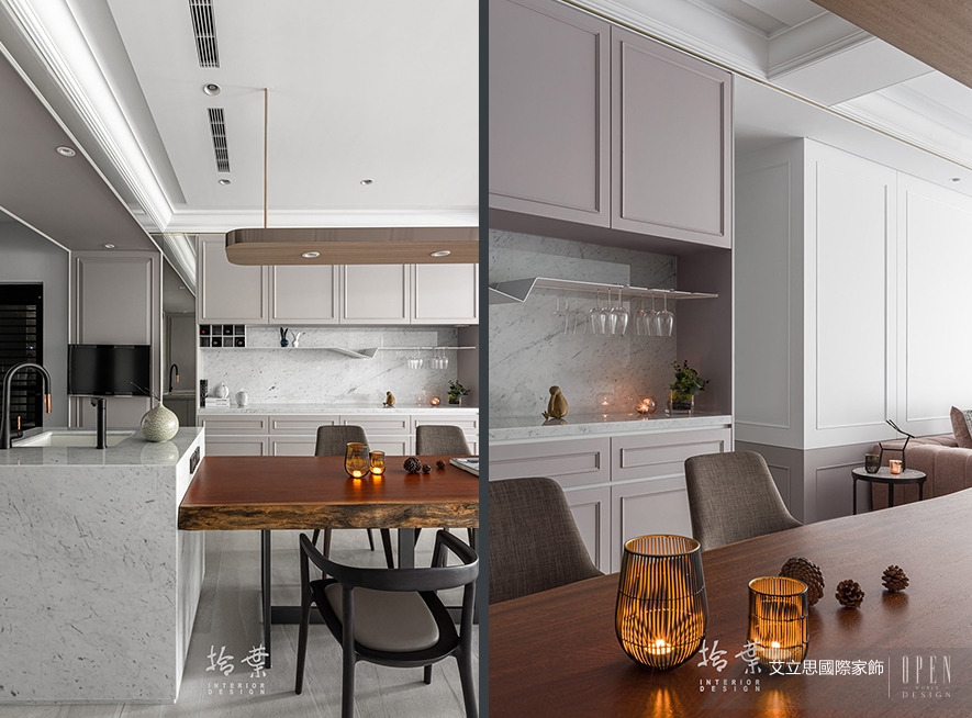 移步至餐廳,一座質感厚實的中島映入眼簾,由屋主喜愛的耐磨雞柚木餐桌,以及木質方塊形吊燈組成,跳脫周圍的淡雅色調,圍塑一處半獨立、類包廂的小區域,讓家人於用餐時分,能以更沉靜舒緩的心情交談互動;而為在靜謐中融入活潑有趣的生活氣息,餐桌兩側,選用同為深棕色、卻造型相異的兩組餐椅,並藉由柔軟搖曳的燭光,於桌面、餐廚櫃點綴照明,調和周圍木、石材質的冷硬感,溢散獨立天地的溫暖氣氛與浪漫情調。