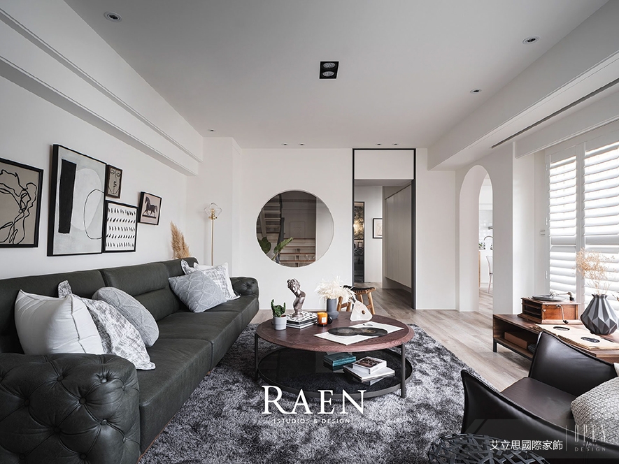 明亮淨白揮灑於公領域,歐式藝廊風情呼之欲出,通透的設計手法,使陽光漫溢室內,如同畫框般的圓窗,予以場域視覺放大效果。地坪上的灰調毛絨地毯,延伸至皮革墨綠色沙發,兩者於異材質中碰撞協調韻味,而沙發扶手上極具巧思的金屬釘釦,則隱約透露華美氣質,其後牆面自在鋪展的塗鴉風畫作,更將藝術、慵懶氛圍充分展演。
