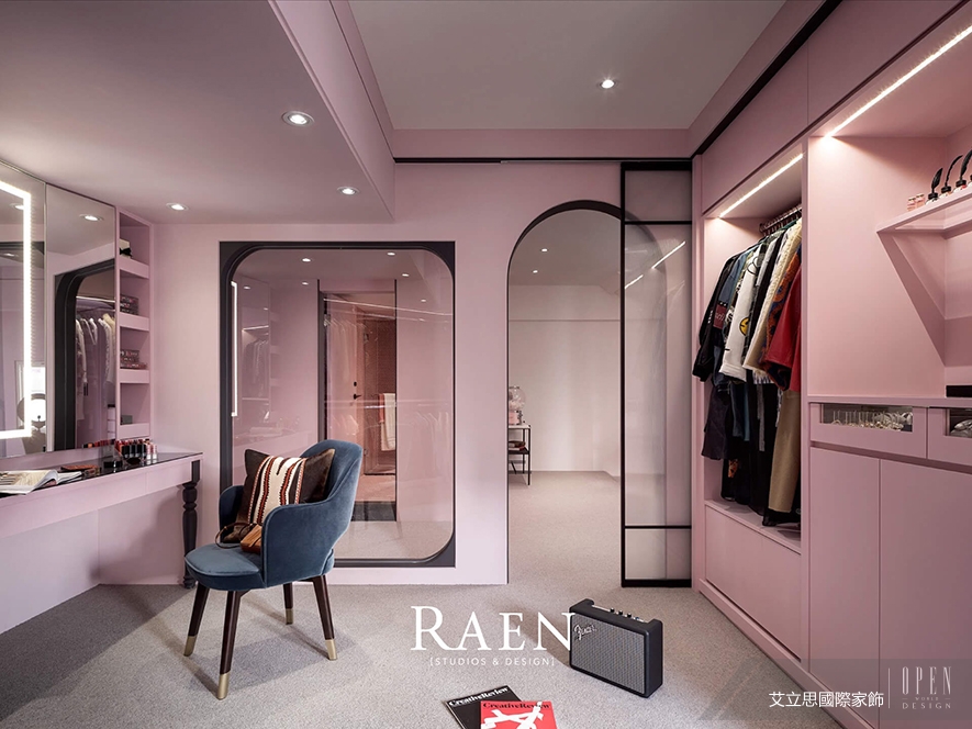 拾階而上,來到高雅迷人的二樓更衣室,五感隨即熏染電影《第凡內早餐》的輕快情緒,女主角奧黛麗.赫本於片中望向櫥窗的經典畫面,以摩登情懷柔美再現。而偌大的空間,流瀉一派粉色情調,引人注目的機能化妝台,則可以適宜轉換完美視角,便於業主於此工作,而一旁的藍綠色絨布化妝椅,予以空間精緻感的同時,也串連色彩的關聯一致性。