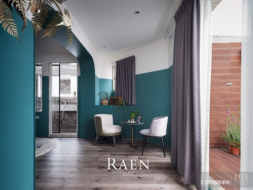 設計師將梯形的格局場域化零為整,並以圓弧、拱門形狀,貫穿成為整體的核心精神,使歐洲街道的既視感幻化眼前,同時在公、私領域以白、粉及藍綠色,配搭不同樣式的家具,和諧地融入生動靈活的氣息,形塑業主的藝術家品味人生。