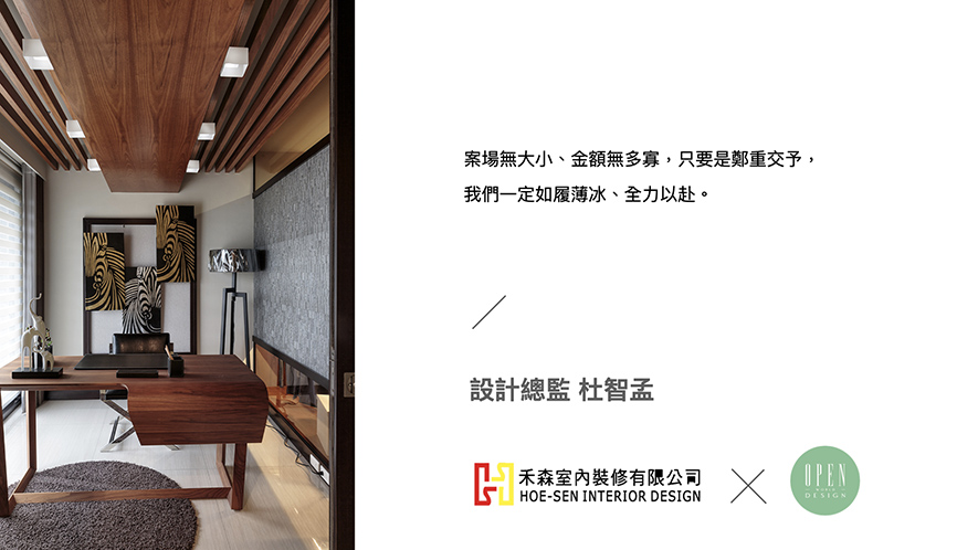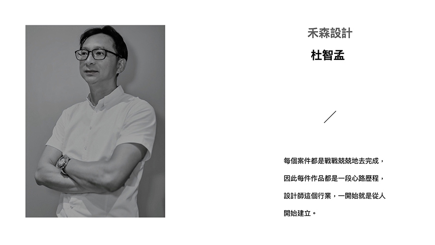 禾森設計 杜智孟 設計總監 立足品牌與團隊之後,成為強而有力後盾的同時,也攜手成員們一同邁向燦爛的未來,而無論是總監對客戶服務的敬業態度,或是對於作品無微不至的照護,最終都會成為甜美的養分,反饋到禾森團隊,使得絕美風光永不止息地展於世人眼前!
