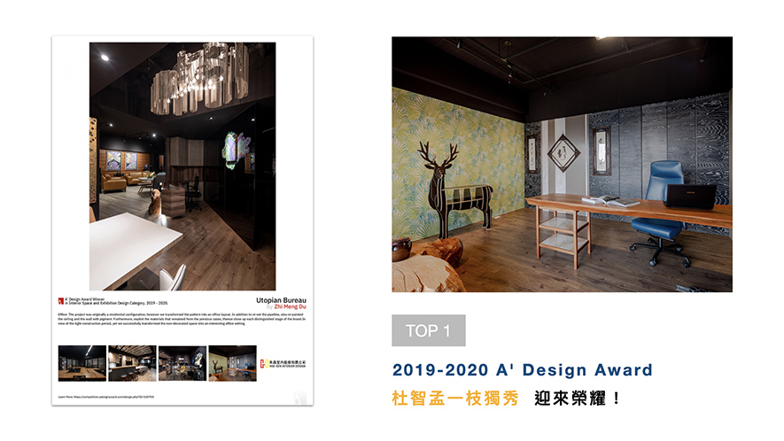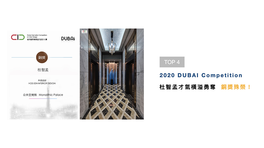 「杜拜國際專業室內設計大賽」由中華文化促進會,以及中東代表機構和中東杜拜專業室內設計師協會聯合主辦,並以特色BEST TO BEST大獎,吸引設計師爭相角逐。杜總監於作品《山瀾暮嶼》中,將大自然的山水景緻,重現於公設入門處天花壁面,奪下「銅獎」殊榮,替團隊開展新的國際視野!