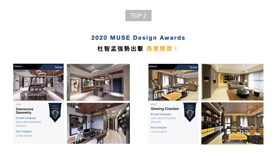美國MUSE Design Awards由歷史悠久的國際獎項協會IAA主辦,以發掘全球設計繆思為宗旨,為建築、室內、時尚等領域提供全面的發光舞台。杜總監首度參加國際大獎,就以線條感強烈的《線裡線外》,及散發明亮暖意的《豐光盛室》作品,雙雙拿下金獎,為品牌里程再添榮耀!