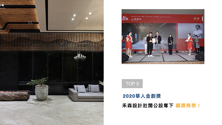 「華人金創獎」向亞洲設計菁英遞出橄欖枝,鼓勵各地傑出之室內設計師,就其獨特的創意空間美學、前瞻設計思維與材料構築綠能設計,來回應當代「社會設計」的深度與廣度。禾森設計於公設作品《山瀾暮嶼》中,展現不同以往的情境表達,其精緻手法獲得「公共空間類」的「銅獎」殊榮!