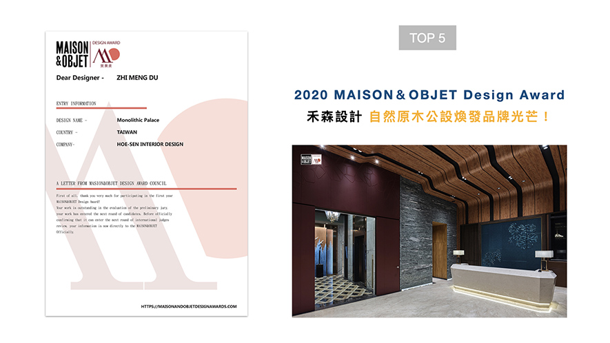 於2020年設立的MAISON&OBJET Design Award(美奧獎),其獎項結合「展、學、研、產、銷」多方專業,旨在「發掘好設計,創造好生活」,向全球傳遞美好生活方式,提升生活品質。禾森設計在作品《山瀾暮嶼》中,將山水意象進駐公設,重現業主理想的自然原木本色,榮獲2020美奧獎肯定!