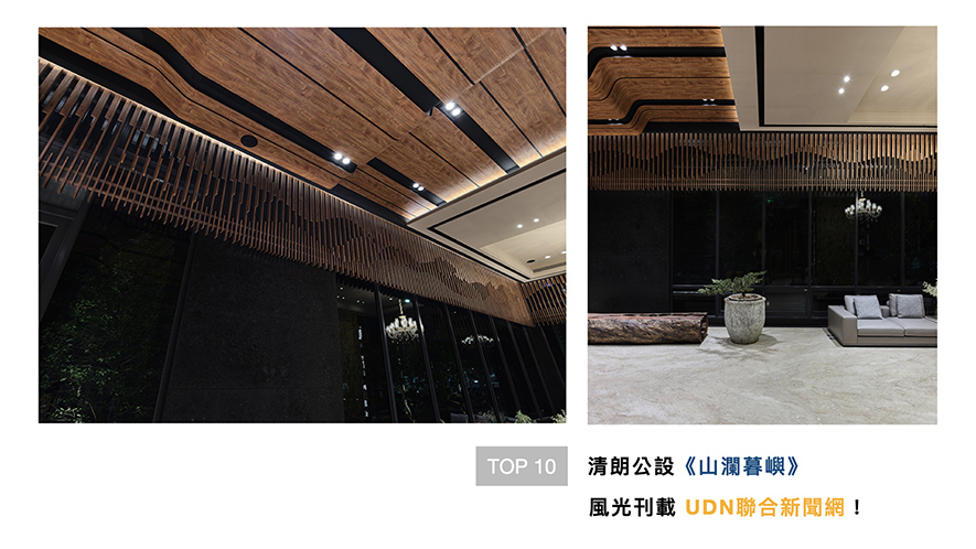杜總監透過引渡山水意象進駐公設,以及突破日常的天地壁構圖,最終鋪敘出色彩濃豔卻寬闊非凡、具流動性的量體《山瀾暮嶼》,明媚的設計風采獲「UDN聯合新聞網」強力刊登!