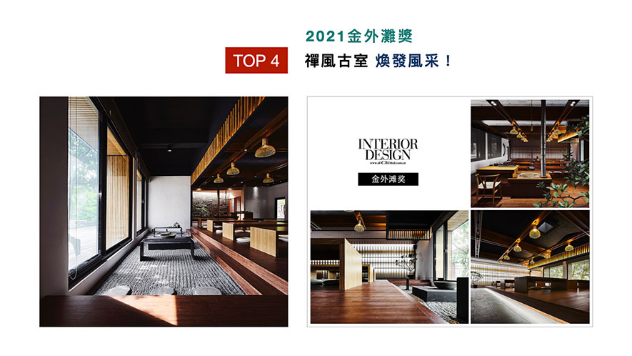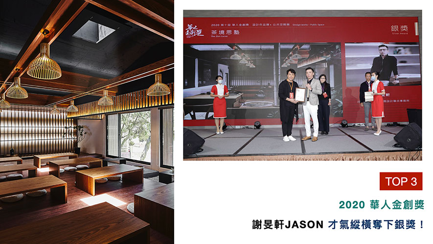 「華人金創獎」向亞洲設計菁英遞出橄欖枝,鼓勵各地傑出之室內設計師,就其獨特的創意空間美學、前瞻設計思維與材料構築綠能設計,來回應當代「社會設計」的深度與廣度。謝總監於茶藝教室《茶境思塾》中,融入建物內外部風光,使得大塊天地同為設計文章中的一部分,拿下「公共空間類」銀獎殊榮,使品牌聲望更上一層樓!