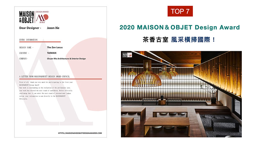 於2020年設立的MAISON&OBJET Design Award(美奧獎),其獎項結合「展、學、研、產、銷」多方專業,旨在「發掘好設計,創造好生活」,向全球傳遞美好生活方式,提升生活品質。謝總監於作品《茶境思塾》中,牽引自然光線,打造出結合學生體驗與文化傳承的沉靜空間,精湛厚實的功力,獲得2020美奧獎評審的大力肯定!