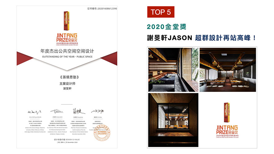 金堂獎2010年正式起航於北京,致力推動「設計創造價值」,而2020年的賽事,在僅有11%的獲獎率之下,謝總監以連結大自然、佐搭禪風調性的作品《茶境思塾》,獲得「年度傑出公共空間」獎項,再站品牌聲譽高峰!