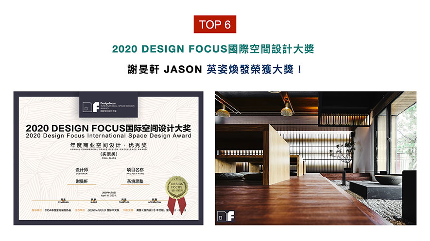 DESIGN FOCUS國際空間設計大獎,邀請行業知名設計師擔任專家評審團,鼓勵獨具創意的優秀作品,發掘更多有潛力的設計師,探索未來空間設計的更多可能性。在2020年共2260件參賽作品中,謝總監憑藉《茶境思塾》一作,表現人本精神,以及回歸早期社會體貼之心,成功獲得大獎殊榮,大展品牌實力!
