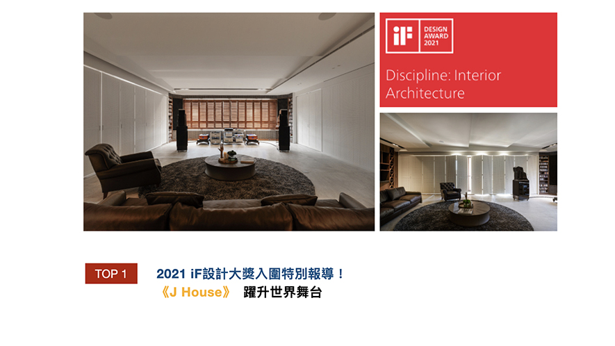 自創立以來,以自然美學、人文設計為品牌宗旨,莊軒誠 設計總監 及俬設計 在每一次的設計作品中,堅持藝術、簡約及品味等五大服務方針,為業主打造出最理想的藍圖,而回首這一年的時間,團隊不僅於國際賽事有亮眼的表現,也深獲各大媒體及各領域業主的肯定,現在就讓我們一同欣賞精彩事蹟吧! 2021年德國iF設計大獎的評選機制,採用數位形式舉辦最終決選,並於第一階段集結91位設計界權威評審,選評出4664件入圍,近50%機率進入總決選。及俬設計於作品《J House》中,以音樂為介質,搭配異材質的變化,將空間的豐富美好呈現於眾人眼前,深獲評審喜愛,進而入選決選!