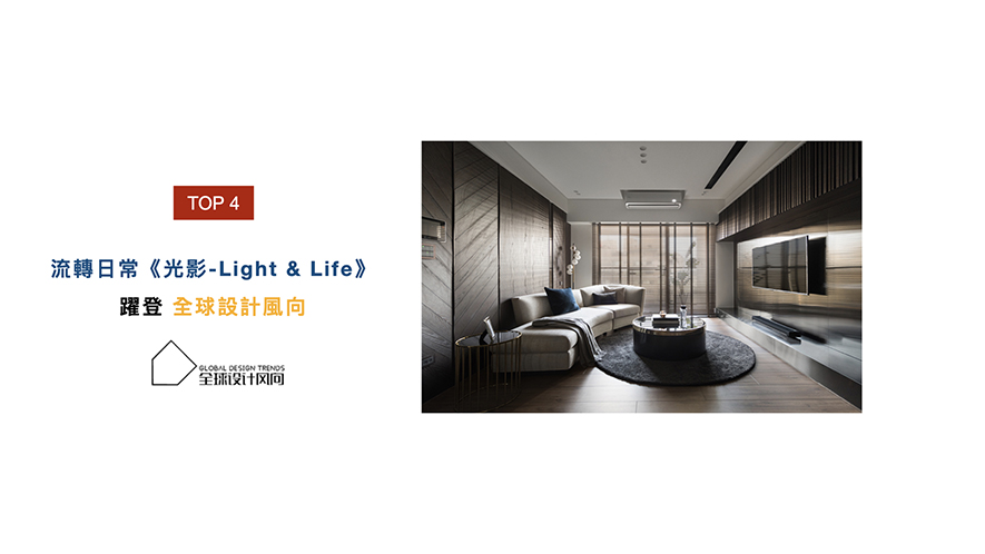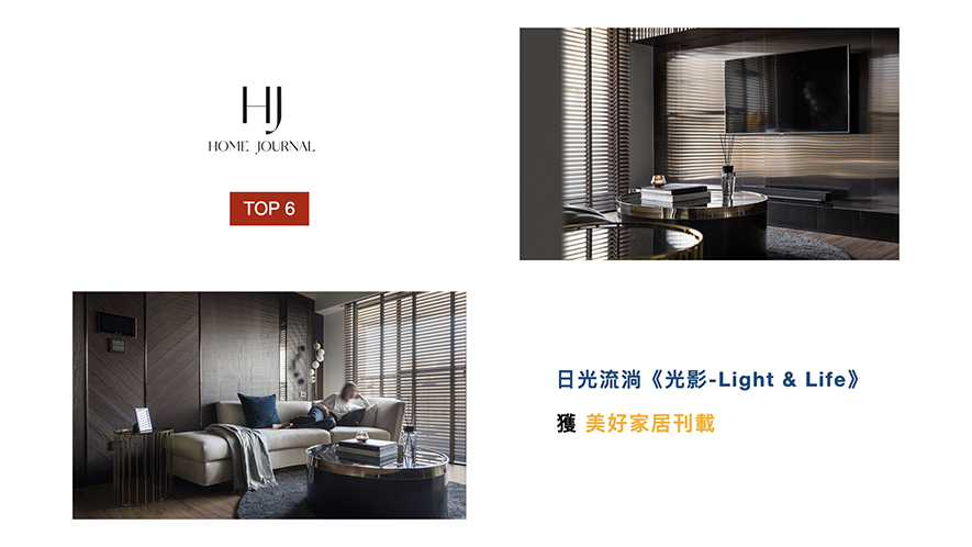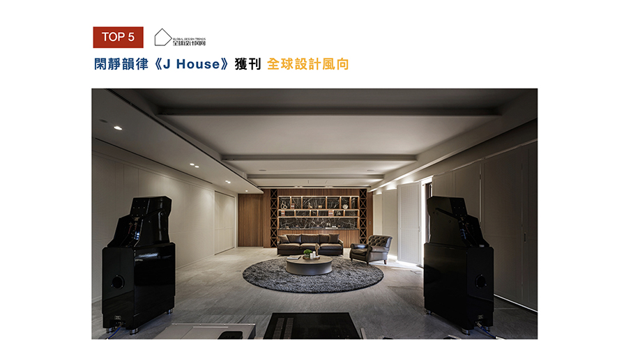 及俬設計的作品《光影-Light & Life》,藉由光影及相同建材的質地,產生瞬息萬變的場域形貌,創造出業主獨特的故事篇章,優美佳作也擄獲「全球設計風向」芳心予以刊載。 「全球設計風向」宗旨為新穎與不假修飾,網站七成用戶全是設計相關領域的從業人員,而莊總監的《J House》一作,以音樂及多樣性的質地搭配,豐富空間生命,並榮登「全球設計風向」媒體版面,將精彩作品呈現給設計迷。