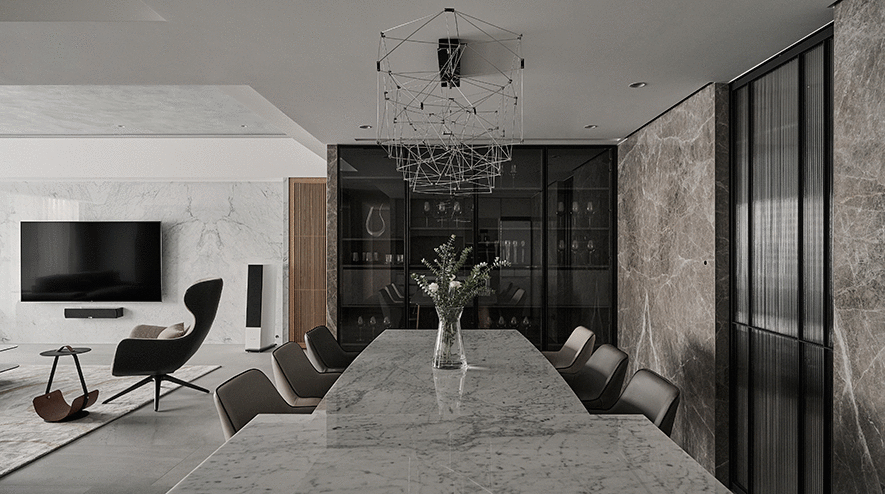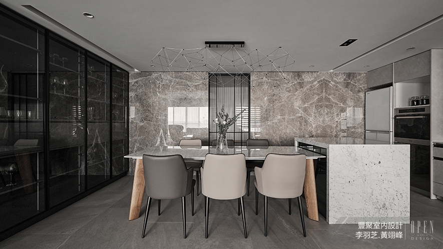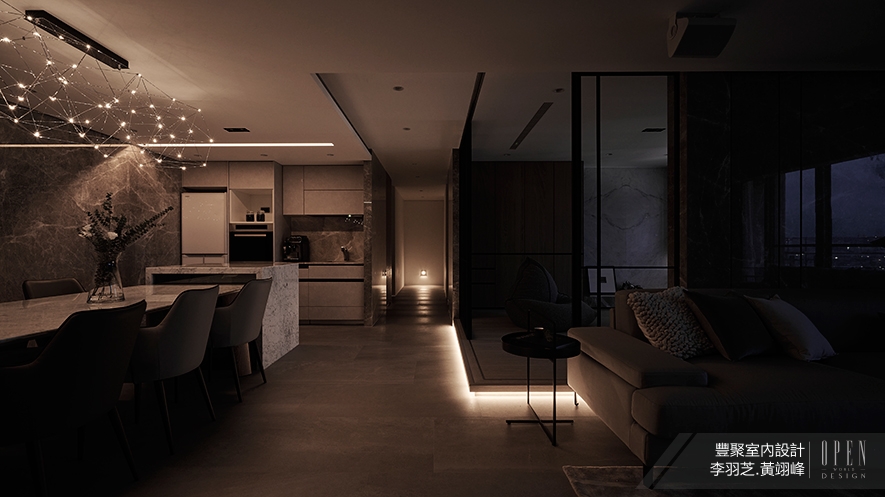 除了延續整體的灰調石材,餐廳一側也選用深玻收納展示櫃,更加放大場域視覺,其周圍裝飾的燈條,伴隨天色漸暗,與天花造型吊燈,點亮一家人夜晚餐食的歡樂序曲,而當夜幕完全降臨,餐桌上方閃爍著點點光芒,宛若滿天星空的景緻,流露一派靜謐韻味。