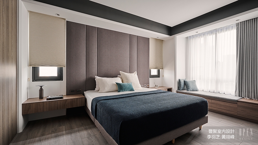 踏入主臥,臥榻旁隨風吹拂的紗幔,正引領著光線入室,暖光串連溫潤木質,圍塑寧靜的睡眠區,而細緻的灰色皮革床頭、靛色床包,疊深流溢沉靜的感受,予以一處有溫度的空間。