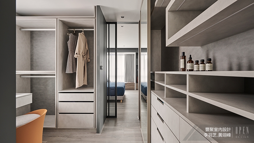 (圖)偌大的更衣室,以井然有序的收納空間,回應女屋主的所需,灰白色系的櫃體,則詮釋全室的現代感受。