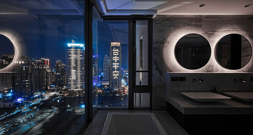 (圖)主臥浴室予人恍若高級飯店的既視感,沉浸環景浴缸,搭配窗外夜景,回歸身心靈安逸,而寓意圓滿的立面雙圓鏡,則於夜晚增添寧靜之感。