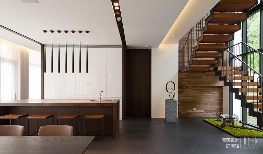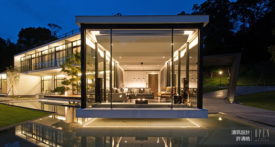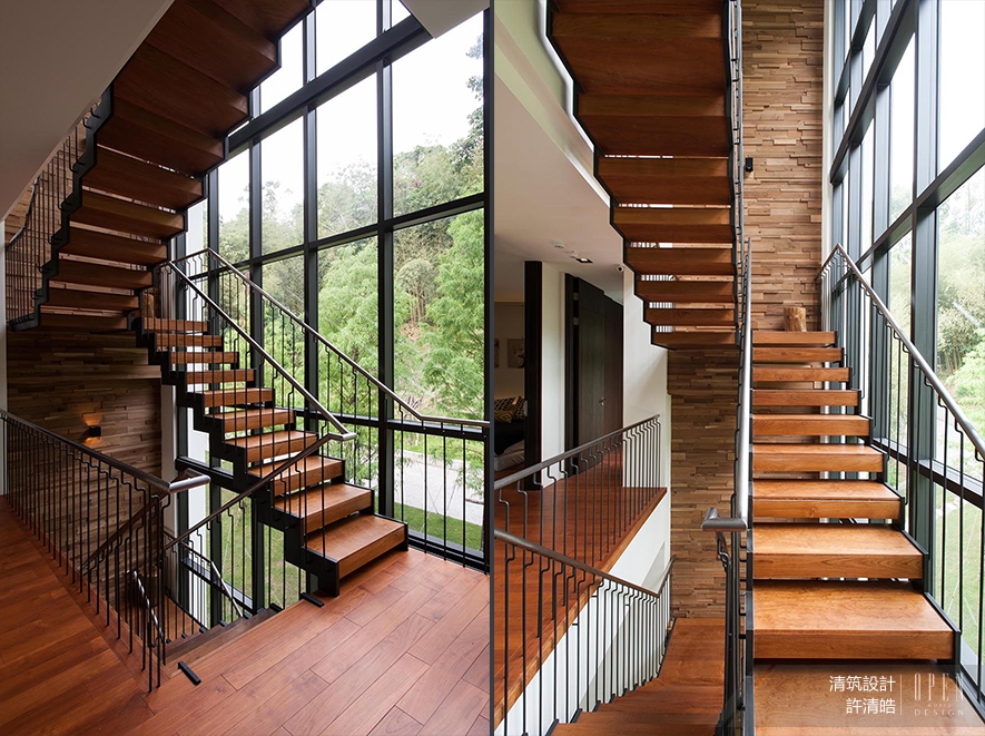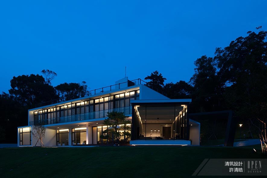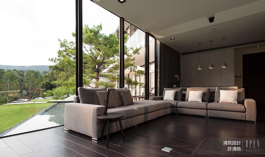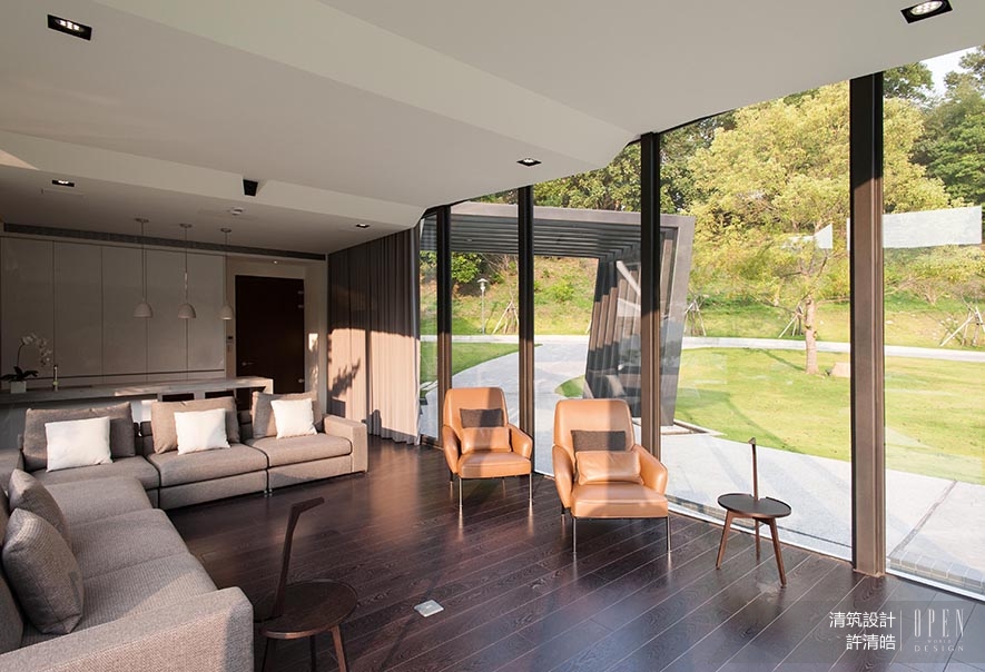 基地位置位於山林中,因地利之優,建物周遭環繞著優美景致,考慮台灣亞熱帶氣候,全棟門窗採用節能綠建材、具隔熱效用的Low-E複層玻璃,大面積的穿透式玻璃和開窗設計,消弭戶外與室內的界線;比起華麗的裝飾,以自然作為素雅妝扮,顯出量體的脫俗氣質。