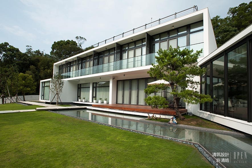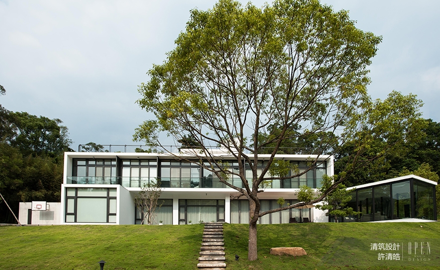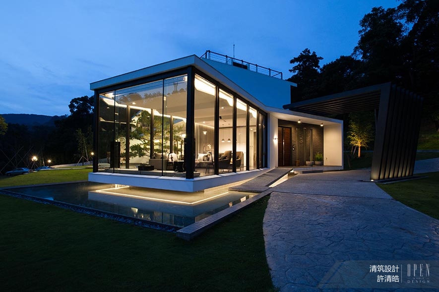 建設初始,團隊盡可能保留原始地貌,且留下原有的大樹,顯露近似梯田坡度的地坪,將外牆漆以德國奈米漆,抗污不染塵;防蟲害及形塑視覺漂浮效果的水塘,亦被預先開鑿,具護城河的水池圍繞全建築,建物宛若漂浮水中央,透過水泥板步道的銜接,引領居者浸淫其中。