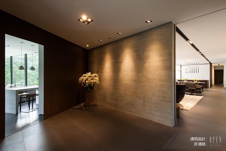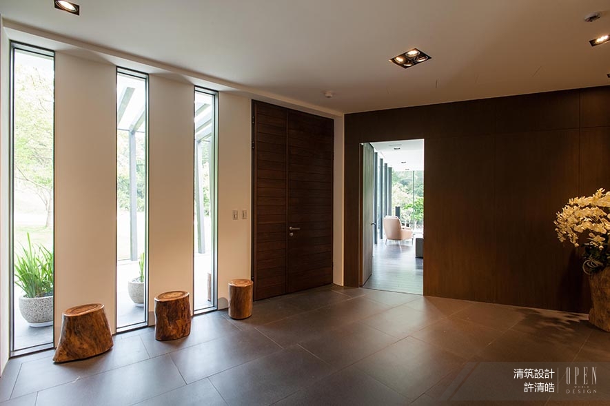 玄關處為通過迎賓車道後,入門第一眼望見的空間,簡潔場域將區塊分流為二,分別導往三面皆玻璃牆的視聽處所和客餐廳,藉此緩衝地帶,更加避免兩處的利用相互打擾。