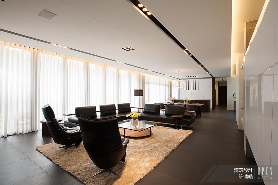 自玄關進入客廳,右側為透過烤漆隱藏的電視櫃和展示櫃,左側則為瓦斯壁爐,不僅有除濕之效,更溫暖居者身心。天花板上兩條平行槽線,導引視線由客廳、餐廳直至尾端吧檯區,使格局更顯貫通。