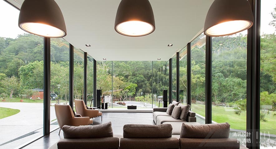 The audio-visual room is equipped with the functions of rest, chitchat, and digital entertainment. Further, in view to work in concert with the exterior space, hence, set up the three sidewalls of clear-glass and supported by the steel structure. In addition, make use of cement to construct roof and ground, and then generate the harmonious interaction with the natural surrounding.