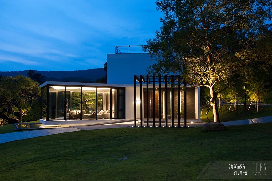 堆疊出輕巧無壓的盒體建築,團隊構築出與自然相容的私人空間,保留地勢起伏及大樹,以山水木石為素材,運用純粹簡約手法,使鄰近河川的建物,在綠茵環抱中展露方正明亮,最終誕生兼具機能與大塊文章之美的世外桃源。