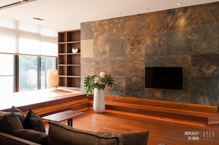 結合石材及木質地,空間聚合粗獷和自然景致,兼備暖意與溫潤之感;電視牆使用的鏽板石,能夠隨著時間改變紋路,牆面特色質材的使用,亦使區塊表情更加豐富。