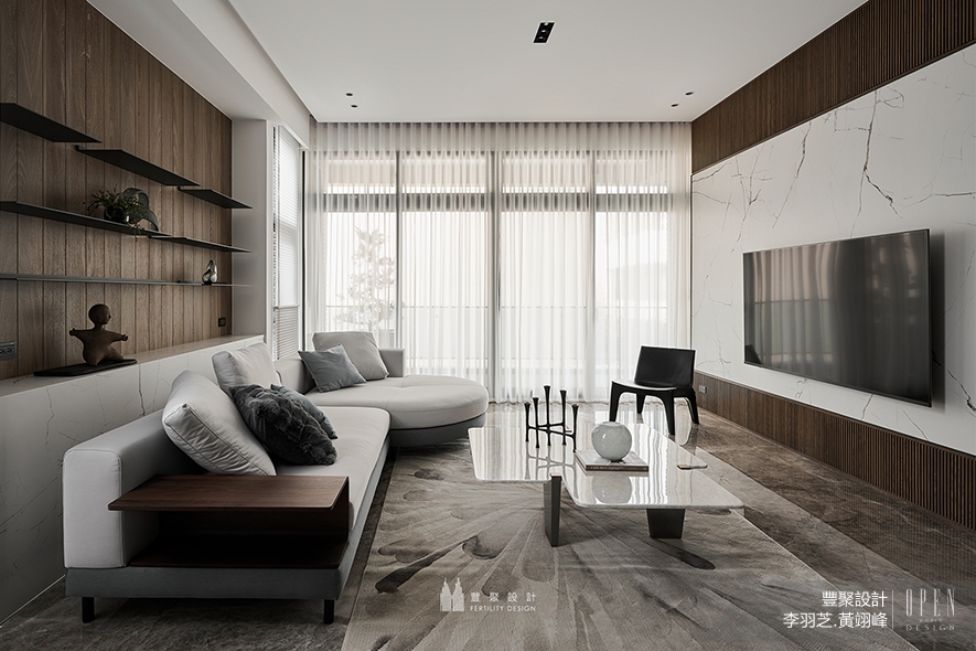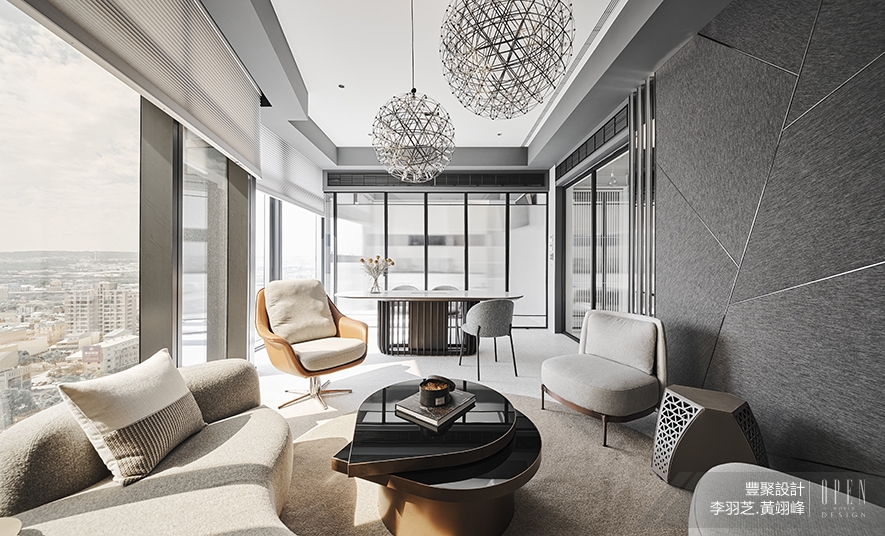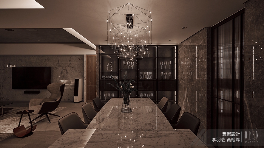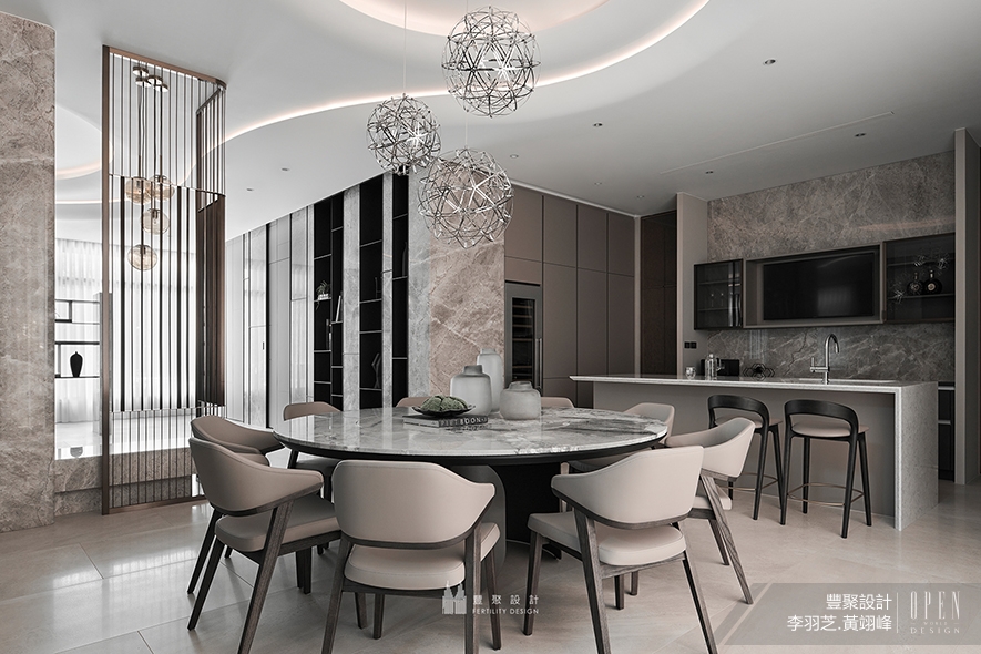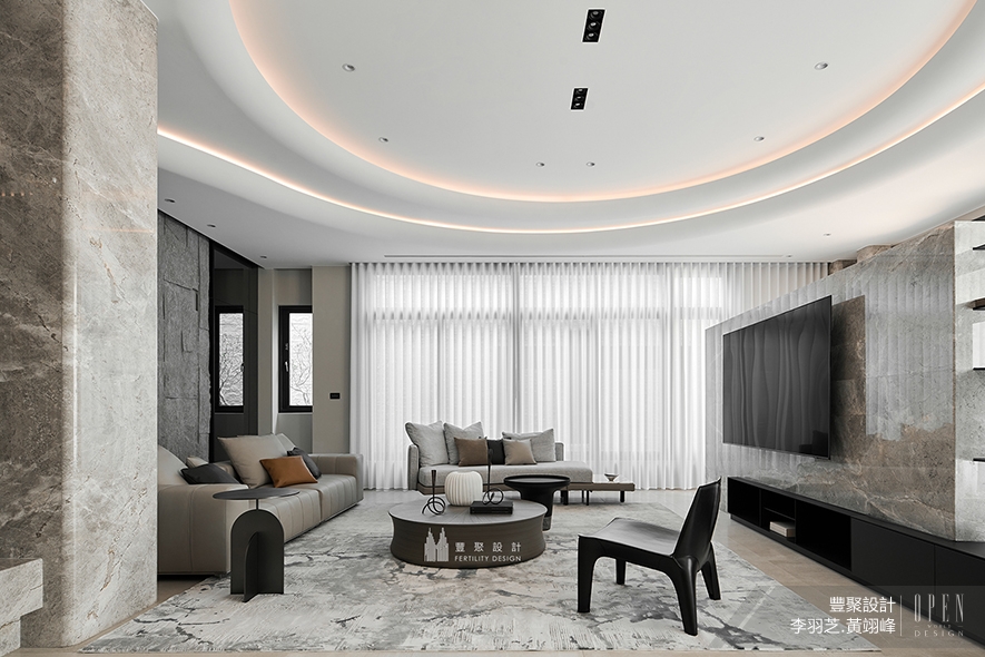 內部一共入住三個家庭,兩位總監分別依照各家的需求、喜愛的風格去設計內部,完成統整規劃,並將有圓滿和8(發)寓意的圓弧造型置入一樓公共空間的天花板,作為對業主家族的祝福,周遭壁面則運用大量石材搭配鐵件展示櫃,供屋主依據自身品味擺置收藏品,營造現代恢宏的門面氣勢。