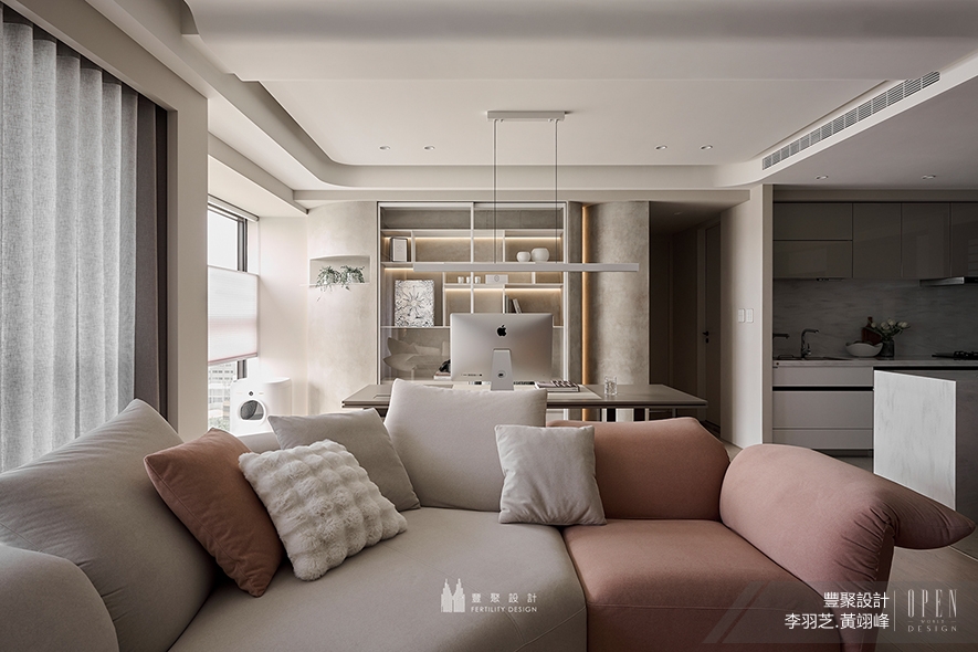 商空之外,兩位總監也和我們分享近期竣工的家宅新案,專屬屋主和三隻貓的《Rosy-fingered微粉寓所》中洋溢暖灰和浪漫粉色,透過整理三房格局為一房的大膽巧思,釋出書房、廚房隔間的空間到公領域,再打通住宅深處的兩間房間,改為包含更衣間的舒適主臥,讓26坪的住宅擁有如放大兩倍的開闊視野,安放可容納十二人的餐桌也不顯侷促,「業主的朋友很多,又喜歡邀請他們來家中作客,因此需要很大的招待空間。」李總監笑著回憶:「這也是他(業主)常開玩笑說我們把他家變成兩倍大的原因。」