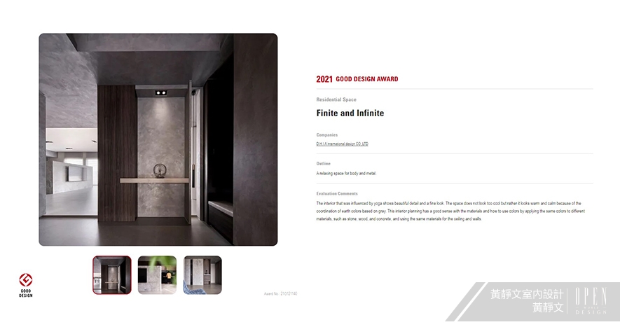 以「空、極簡,卻不失機能」為規劃主軸,D.H.I.A黃靜文室內設計 黃靜文 設計總監 運用減法設計最小化陳設,搭配貼牆式收納,令使用者與空間更加親近,輔以質樸純粹的大地色塗料,創造漫溢自然氣息的寬敞家宅《Finite & Infinite》,吸引本屆賽事評審目光,榮獲Good Design Award獎項!